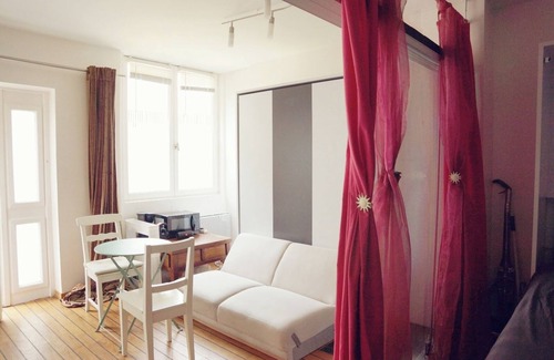 Kitchen (induction hob, fridge, cooking tools). Wide shower opened on the bedroom. Sleeping availability : 2 beds, 4 people. The bedroom is furnished with a wall bed, brand new mattress (140 x 190 cm, 55 x 78 inches). Another wall bed is in the living room (same size, new mattress too). These beds were chosen to free up living space. Independant toilet in the apartment (door near the kitchen cf. picture) Washing-machine, Micro-wave. Bed Linen + Towels provided. End of stay cleaning available on request.