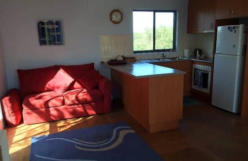 The compact kitchen has a ceramic cooktop, oven and medium fridge. There is a BBQ plus outdoor dining furniture outside on the rear deck, which has stunning views out over Sandy Point. The deck has rails and wire balustrade for safety, but the property is not fenced. Well behaved pets are allowed.