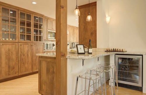 Custom cabinets, stainless steel appliances and a wood paneled refrigerator adorn this well-equipped kitchen. Sunlight streams in from multiple directions. Extras like a wine fridge and small appliances aplenty make this gourmet kitchen a chef's dream. A large peninsula countertop with stools is a great place to enjoy chats with the chef.
