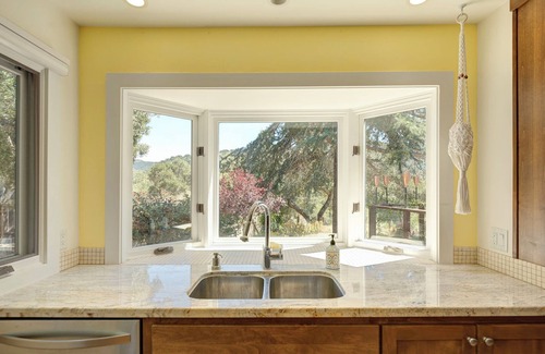 Surrounded by natural oaks, calming hillside views, and an inviting backyard pool. The open floor plan with large windows and skylights provides warming natural light throughout.