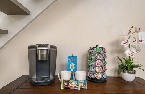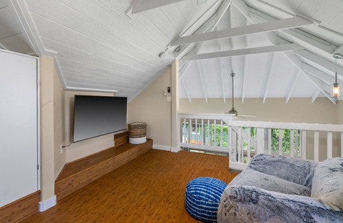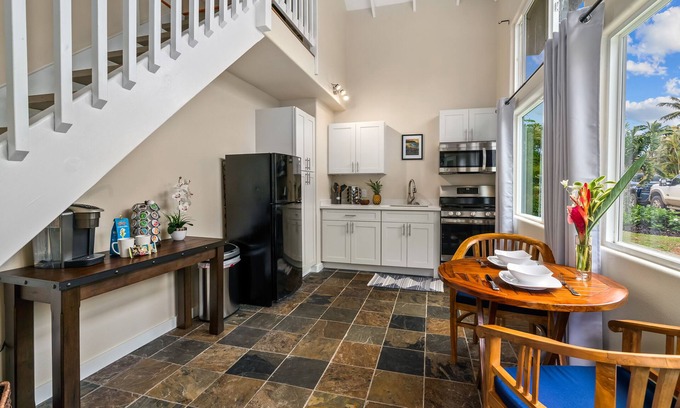 The modern kitchen has everything you need to prepare meals for you and yours in this adorable space, with plenty of cabinets for storage, newer appliances, and seating for 2 at the dining table. Head up the stairs to the loft style bedroom complete with a King bed, smart TV, some extra cushy seating and an en-suite bathroom with shower. Cut up some papaya or noni from the trees in the garden and have yourself an extremely local breakfast.