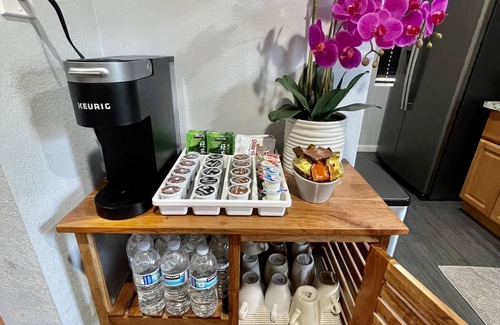 It stocked with complement K-cups coffee (no refill), complement bottles water (no refill), dishes, glasses, silverware, wine glasses, coffee mugs etc. The kitchen has oil, sugar, soy sauce, salt and pepper, water kettle, rice cooker, toaster and cookware you should need for cooking a great home cooked meal.