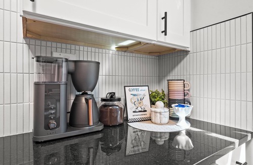 The main level has a full kitchen stocked with all kitchen essentials and some pantry staples, as well as a drop coffee pot and Keurig with coffee pods. There is also an open plan living and dining room with plenty of seating, plus the master bedroom (king bed) and a full bath.