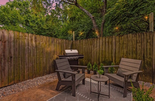 Off the main floor is a sliding door to a private patio with seating, string lights and a gas grill.