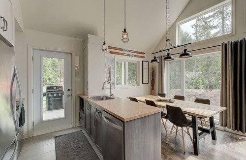 Our great Room is a joy to spend time in! Our open plan kitchen opens up to the dining table and living room, and is the perfect place to enjoy time together. Our kitchen is stocked with cutlery, cookware and essentials -everything you need to enjoy your favourite meals. Large windows bring in the beauty of the surrounding nature and the soothing natural light while you curl up on the big sectional sofa and take in a movie.
