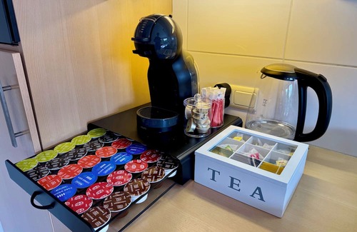 Cook like you’re at home with a fully equipped kitchen: oven, stove, dishwasher, mixer, toaster, air fryer, soup maker, and a cocktail maker. The dedicated coffee and tea station suits slow mornings.