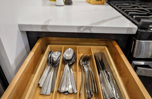 - Fully equipped with pots, pans, toaster, microwave, coffee machine, coffee, knives, bakeware, dinnerware, and cooking utensils - anything you might need!