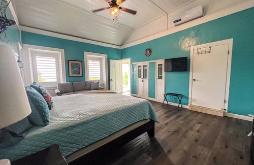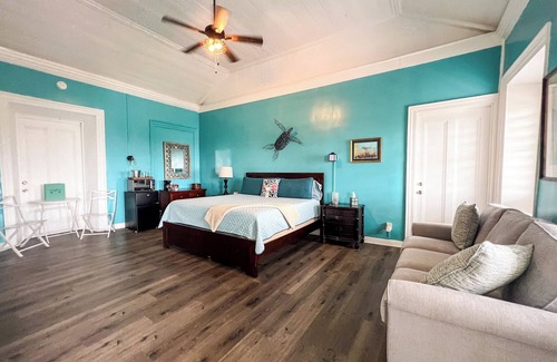 This spacious 3rd floor unit has great views of the Caribbean Sea and the sunsets that the West End is known for. A shared gallery deck with outdoor seating, indoor/outdoor living has never seemed more comfortable. Inside the room you will find a king-sized bed, minifridge, microwave, coffee maker, large bathroom with a walk-in shower, AC, TV, Wi-Fi, ceiling fan. A queen- sized sleeper sofa adds more sleeping options to the room. This room also can be adjoined with The Mermaid and/or The Palm Tree to create either a two bedroom or three-bedroom waterfront suite!