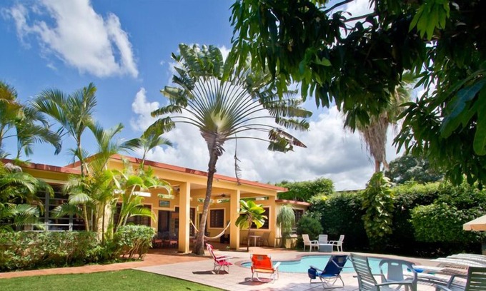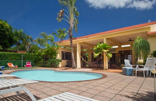 Hacienda Ensenada is a modern home located on over 4 acres of beachfront land in beautiful Rincon, Puerto Rico. This 4-bedroom, 4- bathroom home accommodates 10-12 people comfortably. The unit consists of a 'Main House' with living room, kitchen, Master Suite with bathroom, another bedroom with 2 Twin Beds with adjacent bathroom, and 2 separate bedrooms poolside with private baths each. It offers a private swimming pool, grill, Satellite TV and WiFi internet, washer and dyer, full kitchen with microwave and dishwasher. The beach right in front of the property is the Tres Palmas Marine Reserve, people love to snorkel and surf there. However, depending on weather, at times, the currents and tide may not make it suitable for swimming. A few steps (5 minutes walking distance) away is the popular Steps Beach which is more popular for swimming. Maria’s and Domes Beach (famous surfing beaches) will require a longer walk 20-30 minutes. People with children choose the Marina beach which is at the left of the property which is more friendly for swimming. You can enjoy the most amazing sunsets as you relax on the swimming pool or dine on the ocean view terrace. If you need additional space, please check (VRBO 492812, VRBO#500733, VRBO#514395).