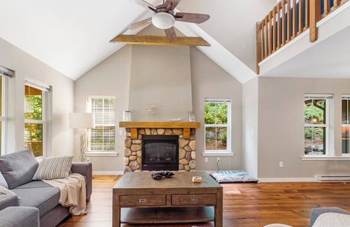 Pristinely kept, surrounded by mature trees and tastefully decorated, the Cottage has been well maintained as one of the newest in the 60 acre complex with beautiful open concept living over two floors. The main floor boasts a bright and open floor plan with vaulted ceilings, hardwood flooring, river rock fireplace, a large kitchen with island, backsplash, granite counter tops & stainless steel appliances with a gas stove. There are two bedrooms on the main floor, including the primary bedroom which has an ensuite and access to the large back patio. Upstairs there is a large loft area, the third bedroom & secret kids playroom. Outside there is a gorgeous extended deck which is partially covered and has lots of room to entertain, as well as a private fire pit area w/hot tub, backing the forrest, and over sized detached garage.