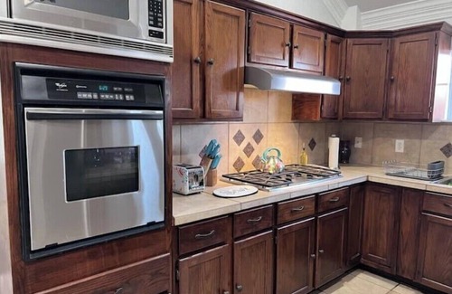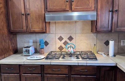 Our home features a Fully stocked kitchen, living area with large TV and board games to play with friends and family. Four bedrooms, two full bathrooms. Master bedroom has a walk in closet. Laundry room with detergent and cleaning supplies. The back yard features a covered patio with outdoor furniture, fire pit, propane bbq grill and an upper deck.