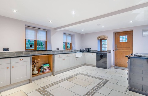 A few steps up from the grand hallway leads to the spectacular living room, where exposed beams and the wood burner add character and warmth. This elegant space is perfect for gatherings, whether for lively conversations or quiet evenings by the fire. The expansive kitchen is at the heart of Waterside House with its dining area, a perfect blend of traditional charm and contemporary convenience. This fully equipped culinary haven includes an iconic AGA stove and a wood burner, creating a warm and inviting atmosphere. French doors open onto a stunning patio area, where you can enjoy alfresco dining or simply soak up the beautiful surroundings. Adjacent to the kitchen is a cosy snug, furnished with comfortable sofas and a Smart TV, ideal for unwinding after a day of exploration.