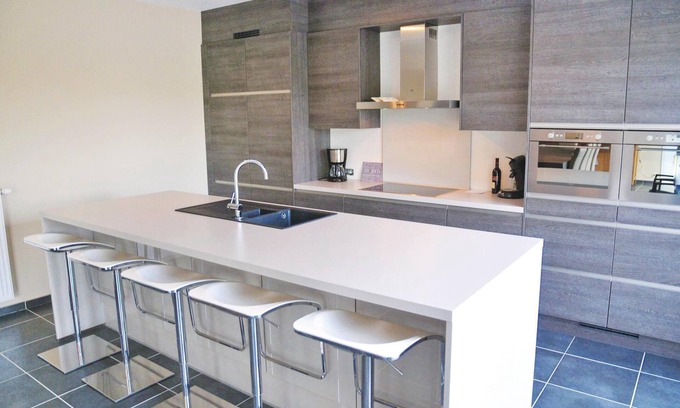 The vacation home is a fantastic villa with indoor pool, near Durbuy (7 km), the smallest town in the world. The villa is located on a secluded site of 2500 m², in the village of Somme-Leuze. The area is not only suitable to enjoy its view from your terrace relaxed, but this is also an ideal area for mountain bikers, hikers and lovers of other outdoor sports. There is a wide range of leisure activities for the whole family. Durbuy with its small streets and nice restaurants, La Roche with its imposing castle ruins, Dinant with its fortress from where you can overlook the Meuse valley, farm golf in the hamlet of Moressée, the Chevetogne site with 12 playgrounds, the menhirs and dolmens in Weris, the grottoes of Han - all this is within half an hour's drive. However, your house is so luxurious and comfortable that you may not even feel like leaving it. Surely you will have a lot of fun with the whole family in the swimming pool (8 m x 4 m, depth 1.50 m). In the game room under the roof there is a kicker, an air field hockey and other games. The living room is cozy and wonderfully comfortable and the kitchen is hypermodern. The cooking island with bar stools also makes it a wonderful place to enjoy an aperitif in a convivial setting. On the second floor there are four bedrooms, each with its own bathroom. In addition, there is a large children's room with two bunk beds (so a total of four sleeping places) and another bed in the bed box. In just a few steps you can reach the house from the parking lot, which can accommodate 3 - 4 cars. The villa is a nice place for a weekend with family or friends. Student parties, bachelor parties and youth groups are generally not allowed here. This house is mainly intended for families. However, other groups can be accepted with the owner's consent and with a possible increase in the deposit.