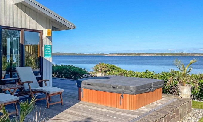 Enjoy the beautiful sea view from the hot tub in this enchanting holiday home.
