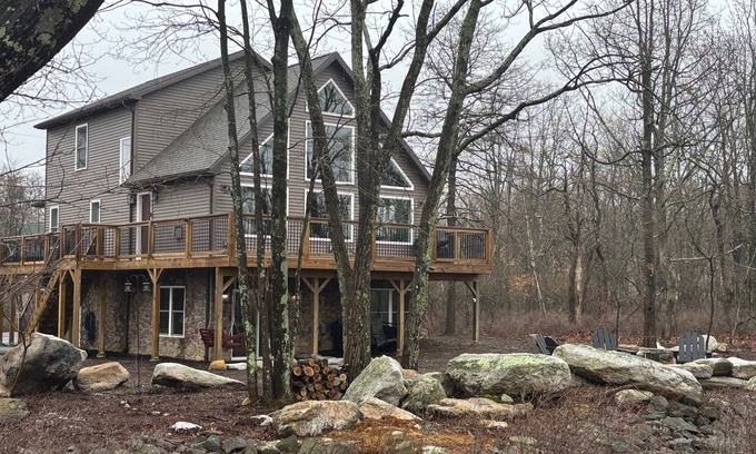 Escape to this enchanting newly built 4-bedroom chalet in Hazle Township. With a king bed, 2 queen beds, and a twin bed, this retreat is perfect for families or groups of friends. Enjoy the convenience of a washing machine, Wi-Fi, AC, and heating. The 2 bathrooms feature refreshing showers and bathtub. Make yourself at home in this amazing getaway and create unforgettable memories with your loved ones. Fall in love with Eagle Rock Resort and enjoy the magic it has to offer. Walking distance to Vista pool, 5-minute drive to Activity Center, Aquatic center, Spa and fitness center. Located on the 3rd hole of the Executive 9-hole golf course or just relax in the loft library with a good book! Quiet secluded street. Outdoor fire pit, ping pong, In the lower level, Gas grille. Please read all amenities and additional info prior to booking.