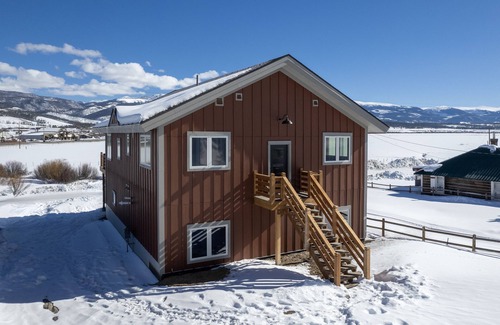 Book this spacious 4 bedroom home in Tabernash - close to outdoors and unbeatable mountain views. New construction on 2 levels - ground floor with large mud room, den, flat screen TV, wet bar, 2 bedrooms and 1 bathroom. The upper floor has vaulted ceilings, plenty of windows to marvel at the mountain sunsets, large deck, BBQ grill, private outdoor hot tub; wood burning fp, flat screen TV, gourmet kitchen, breakfast bar for 4, dining table will seat 6. Also on this floor is a half bathroom, laundry room.