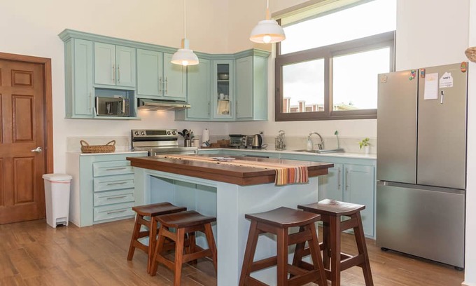 Welcome to this enchanting house in Tela. With 4 cozy bedrooms each with their own private bathroom, including 2 queen beds, 1 twin bed, and 2 full beds, this property is perfect for families or groups of friends. The 4 bathrooms are equipped with showers and hair dryers for your convenience. Wifi, private pool, outdoor pergola with grill and picnic table, generator provided and walking distance to beach. Relax in the pleasant living room with a comfy sofa bed. Immerse yourself in the cool atmosphere of Tela and create unforgettable memories with your loved ones. Fall in love with Tela and enjoy the magic it has to offer.