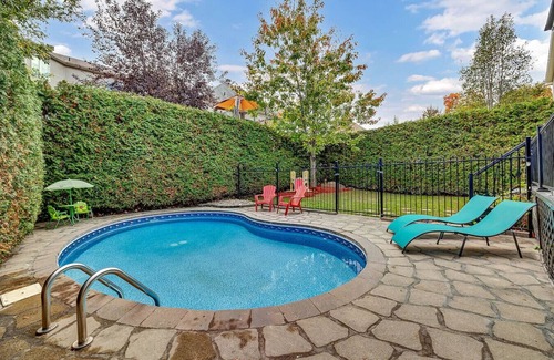 Modern 4-bedroom house with gym. One full bathroom and two powder rooms. Washer/dryer. Fully equipped kitchen with everything you need. Beautiful backyard with heated in-ground pool, relaxation area with patio and barbecue for enjoying the outdoors. Gas fireplace in the living room with workspace. The pool is open during the summer season. Please inquire if it will be open when you make your reservation.