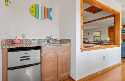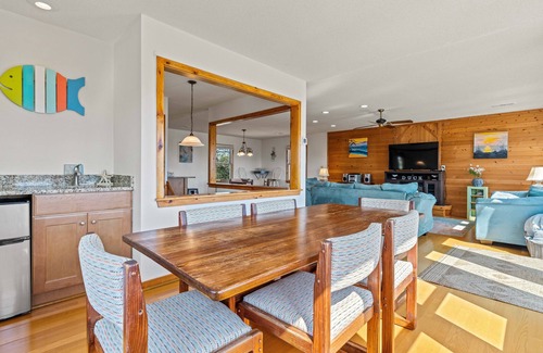 The kitchen is stocked with all the comforts of home, a Ninja Nutri-Bullet juicer, George Foreman grill, waffle maker, coffee pot and all the plates, pots/pans and utensils you could need. Plenty of dining seating and a wetbar.