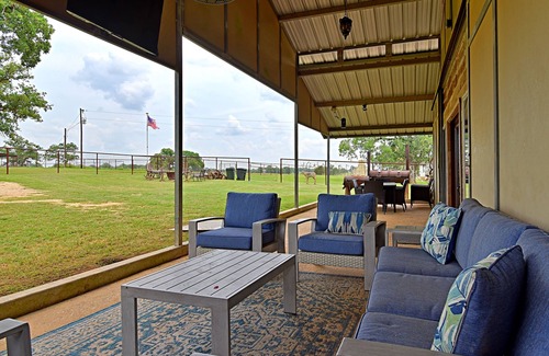 4D Guest Ranch is located on 260 acres of rolling, wooded hills with adventure around every corner. It has 300 wild animals for our guest to view and photograph! Gemsbok, elk, several deer species, antelope, Llamas, sheep, goats, horses, and more. There are 2 stocked ponds that have catfish. The barndo is an amazingly unique rustic but elegant place to stay. It has 5 bedrooms and 3 full bathrooms. The master offers a king size bed . 1 room has 2 sets of bunks, one a twin size and one a full size. The other 2 rooms have queen size beds. The 5th bedroom has 2 twin set of bunks. It is an actual barn that has been modified to be a house. The original metal bar doors remain on the left side for their beauty . The bedrooms on the right side have sliding wooden doors for privacy. There is a full kitchen, a great room with a dining area, a living area and game room equipped with a pool table. The living area has plenty of comfortable seating and a 110' projection screen tv. There is also a Harmon Kardon Amp for blue tooth music. It is decorated beautifully with functionality and comfort in mind. The patio area has plenty of seating and 3 flat screens to enjoy while you bar b que on the large wood/charcoal smoker pit and enjoy the gorgeous countryside with your friends and family. Private swimming pool to cool off and relax in. This isn't any ordinary vacation/retreat! When you stay at the ranch you have access to all of the natural beauty and wildlife with a wood burning fire pit under the stars. The barndo now has a laundry room.