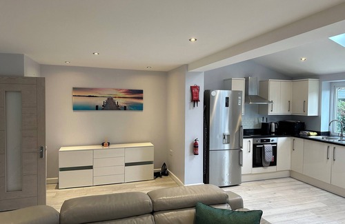 A large open space kitchen/ living room, 2 free parking spaces at the front of the house, back garden, washing machine, tumble dryer, black out curtains, very worm house.