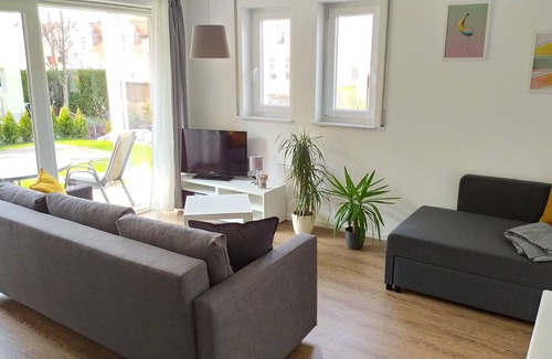 It is located on the ground floor and includes a large living and sleeping area, a kitchen with dining area and a bathroom. A private terrace for lingering and barbecuing as well as a small playground around the corner complete the stay.