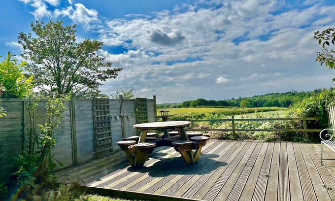 The dining room with dining table and chairs for 6 people leads on to a large kitchen with table and chairs and patio doors that takes you to the patio and sprawling garden beyond. The garden has a patio with table and chairs, perfect for an evening barbeque, then take a walk down to the bottom where you will find a decked area with round bench style table with adjoining seating, this is where you can sit with a glass of wine and watch the sun go down and admire the countryside views.