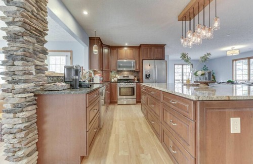 Relax in the spacious open-concept living area, featuring comfortable seating, a large dining table, and a fully equipped kitchen with modern stainless steel appliances. Step outside onto the deck for a barbeque, or soak in the peaceful environment from the hot tub. Enjoy movie nights or game nights in the entertainment room, complete with a wraparound sofa, 65` TV, gaming consoles, pool table, card table, and a variety of board games.