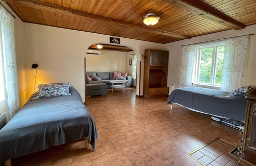 Layout: Kitchen(cooker(electric), hood, coffee machine, microwave, fridge-freezer), Living/bed room(2x single bed, TV(swedish TV channels)), bedroom(2x single bed), bathroom(washbasin, shower, toilet, washing machine), heating(electric), garden, garden furniture, air to air heatpump