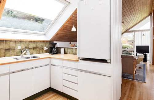 Layout: open kitchen(cooker(electric), hood, coffee machine, microwave, fridge(+ freezer)), Living/bed room(TV(cable, german television channels, danish TV channels (DR1 and TV2)), CD player, stereo unit, high chair), bedroom(double bed, children's bed), bedroom(double bed), bathroom(bathtub or shower, washbasin, toilet, washing machine), heating(electric), terrace, terrace(roofed), BBQ, air to air heatpump