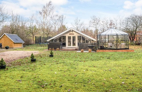 Layout: Kitchen(cooker(electric), dishwasher, fridge(+ freezer)), Living/bed room(TV(german television channels, danish TV channels (DR1 and TV2), norvegian TV channels , swedish TV channels), stereo unit), bedroom(double bed), bedroom(2x single bed), bathroom(washbasin, shower, toilet), heating(electric), terrace, garden, garden furniture, sun loungers, football goal, air to air heatpump