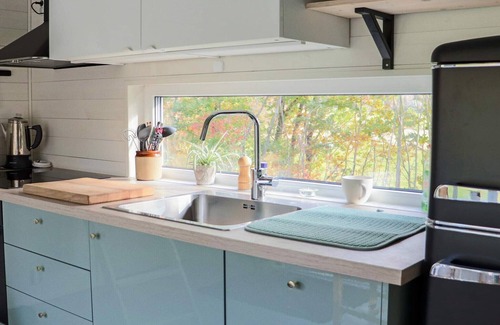 Layout: Kitchen(stove(induction), coffee machine, microwave, dishwasher, fridge-freezer, high chair, water from well), Living/bed room(double folding bed, TV, chromecast), bathroom(washbasin, shower, toilet, washing machine), mezzanine(single bed), mezzanine(single bed), air to air heatpump