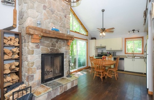 The cottage has 2 levels and layout offers 1 bathroom, kitchen, dining room and large entertainment room on the main level and 3 bedrooms, 1 bathroom and laundry room on the lower level. Cottage has wide plank pine floor on main level and high end laminate flooring on lower level and the most impressive floor to ceiling stone, wood burning fireplace.