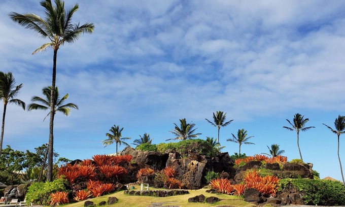 • Two hot tubs, one in a shaded grotto with waterfall, the other in the bright Hawaiian sun