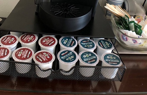 • Keurig coffee maker with complimentary coffee & condiments.