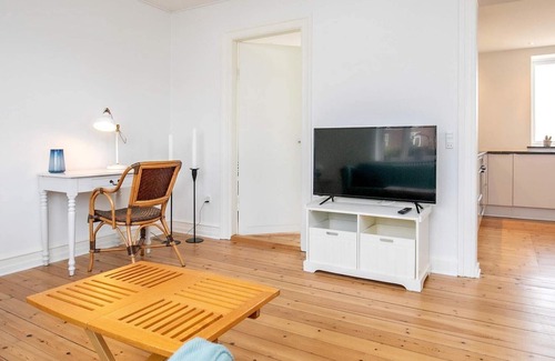 Layout: Kitchen(cooker(electric), hood, coffee machine, microwave, dishwasher, fridge-freezer), Living/bed room(TV(german television channels, danish TV channels (DR1 and TV2))), bedroom(double bed), bedroom(2x single bed), bathroom(floor heating)(tumble dryer, washbasin, shower, toilet, washing machine)