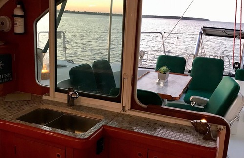 The center of the boat has a full kitchen and dining area with a dining table and couch area. Plenty of room for lounging in the cockpit area, or relaxing over the water enjoying sunsets upfront on the trampoline area.