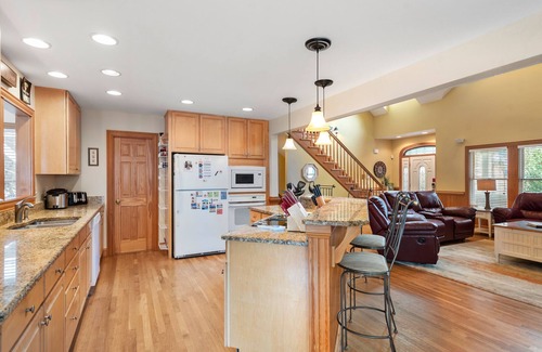 The lower-level game room has a roomy sectional couch and TV for the kids movie night, while the den is the perfect place for adults to gather with a flat-screen TV, freestanding bar with bar stools and access to the pool. The outdoor living area offers a shady space to relax while the kids are in the pool, or watch over tonight's dinner on the gas grill.