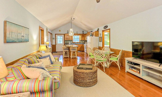 As you enter the home you'll be greeted by golf-themed wall art, which is quite fitting given the lively golf community where this cottage resides. The cathedral ceilings, hardwood floors, and nautical decor throughout boast a coastal and woodsy ambiance, combined with new appliances and countertops for unparalleled beauty. One glimpse at the kitchen's quartz and granite countertops with a mosaic backsplash and you'll fall in love! The white appliances combined with the light wood cabinets add a vivid brightness to the area where you'll prepare some of the best meals and memories of any vacation! And there's plenty of seating for the entire family, between the bar with stools and the round glass dining room table. Out the sliding glass doors of the living room, you'll find an uncovered back deck that overlooks a small wooded area between Lunar Cottage and Sea Scapes Golf Links.