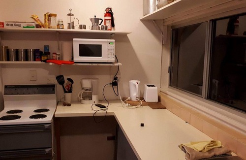 The kitchen comprises cooker stove ,microwave, coffee pot,toaster etc . we will leave the u coffee tea and milk. .The woodfire bakery next door may tempt you with delicious home made goods supermarket 3 doors down