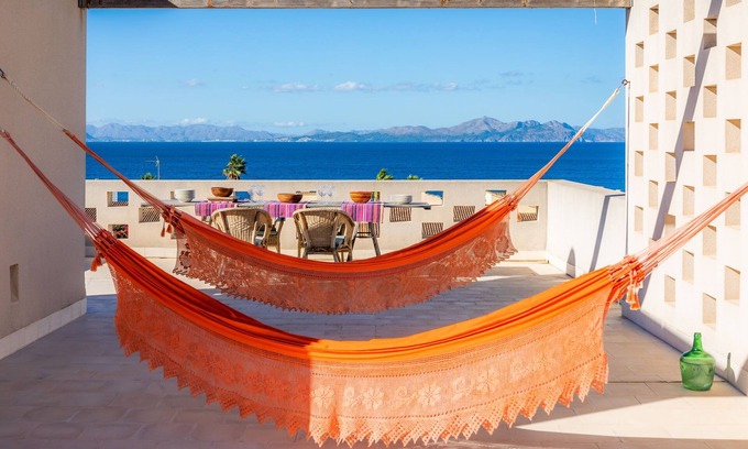 The modern Villa Mercedes is located in the third sea line in the Colonia de Sant Pere. A unique, qualitative object that was designed by the owners with great attention to detail and heart. The house has a special feature, the bedrooms are on the ground floor and the spacious living-dining area with open kitchen is on the first floor to enjoy the sunshine longer, and the bedrooms are cooler in the summer at night. Directly at the entrance of the villa you have a small green area, like a natural meadow, it is not an English lawn. There you also have a terrace with comfortable seating, where you can enjoy the sun until late in the afternoon. On the ground floor are the four functional bedrooms, all with fitted wardrobes and fans. The bathroom has two sinks and a large shower, this has no door, but the toilet already. Two additional guest toilets are located outside at the entrance of the house, and directly at the living room. The modern staircase leads to the spacious living-dining area with sea views. The living area is cozy and functional, Wi-Fi is available throughout the house and underfloor heating. The open, fully equipped kitchen is modern and has enough closets to store everything you need. The large dining table has enough space for up to 8 people or more, in the morning and in the evening there is a beautiful light. Behind the living area is a staircase from where you get to the large roof terrace. This offers a unique sea view from Betlem to the Cap de Formentor. A large dining table and two hammocks help to feel the absolute holiday feeling! Sports enthusiasts will get their money's worth. In the garage are bicycles, paddles, snorkeling equipment and much more available! Also in the garage is the washing machine and dryer. A holiday home for the whole family! For bookings over the winter months, the heating is charged extra !!!