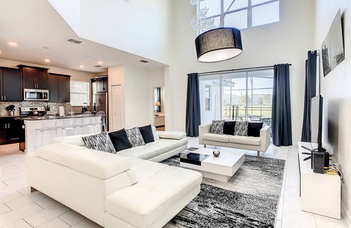 This five-bedroom, five-bathroom single family resort pool home has everything you need to have a perfect getaway. This spacious two-story home has an open floor plan that blends the kitchen, dining room and living room together seamlessly. Using modern furnishings, we have designed this home to ensure our guests have everything they need to enjoy their stay. Whether it's enjoying a relaxing day by the private pool, recouping after a long day at the parks in the spa, preparing a home cooked meal in the fully stocked kitchen or some family fun time in the games room, this home was made for your vacationing needs. With three king bedrooms, a Star Wars themed bedroom and a Mickey themed bedroom, there is something for everyone. Two bedrooms have en-suite bathrooms, and the other three bedrooms all have adjacent bathrooms which makes getting ready a breeze.