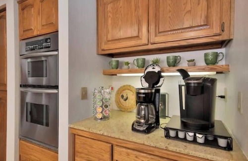 microwave, dishwasher, toaster, and coffee maker. It has plenty of pots/pans, BBQ utensils and