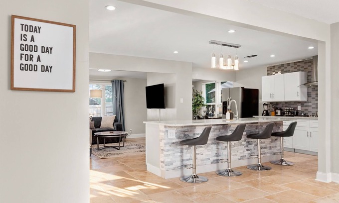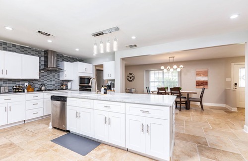 This renovated home offers a nicely opened up dining/kitchen/living space, featuring a cozy sofa and two fun hanging chairs. Relax together and stream your favorite shows, or maybe the new blockbuster movie on the 55" TV. If you'd rather, there are plenty of board games available for a friendly challenge. What a great way to make happy new memories as friends and family.