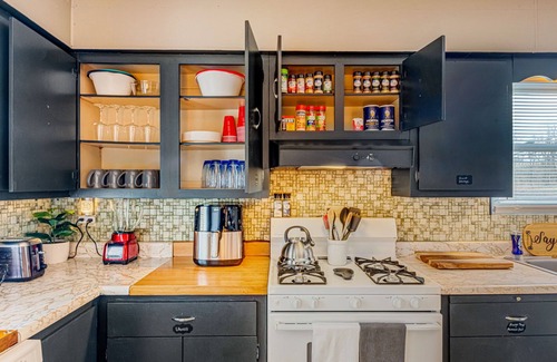 - Kitchen Essentials (Glasses, dishes, silverware, cooking-ware, pots/pans, blender, microwave, toaster, egg-beater, cutting boards, refrigerator, gas stove, dishwasher, wine glasses, ice trays, seasonings, cooking oil, aluminum foil, ziplock bags, seasonings, spices)