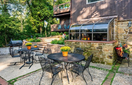 The breakfast bar and the glass dinning gazebo provide ample seating for 10. The kitchen is very generously stocked with all the necessary appliances and then some! Enjoy breakfast outdoors on the patio. There is a unique half bath and laundry room on this level as well. Check out the Living/Game Room on the next level. The unique Geode Gas Fireplace warms and cheers the activities that include pool, Wii games, cards at the bar height table. Maybe enjoy one of the 100+ books curled up on the window seat. In the surrounding Window Room there is basketball and foosball to challenge you. A large deck is off the window room that is a couple steps from the hot tub and play set. The Red Bedroom is on this level with its red bath, queen bed and flat screen with satellite. The Log Bedroom with several walls of the original logs, also boasts a private bath and queen bed. Both of these bedrooms have access to a small deck for viewing the morning bird and animal activity.