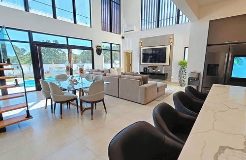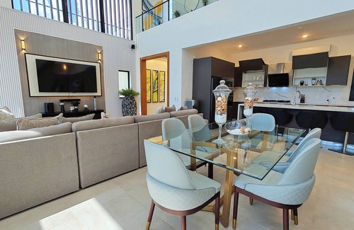 Vacation and Celebrate in Style with your friends and family in this exotic and luxurious property. This perfect vacation spot is located on the Northern coast of the Dominican Republic, close to the crystal clear and warm waters of beautiful beaches. A short drive to Restaurants, Bars, Grocery Stores, and a famous club with frequent shows for an unforgettable night out. Add Transportation Service in our exclusive groovy party minivans so you don't have to worry about a thing.