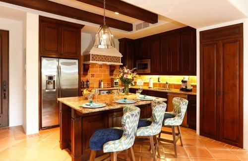 This luxury property is located in Hacienda, an exclusive and safe 22-acre gated community at walking distance from Cabo San Lucas’ lively marina, pulsating nightlife, and sophisticated restaurants. The atmosphere inside Hacienda is of a small, serene European-style village, featuring hand-hewn stone ledger, Mexican cantera stone, dark wood accents, and authentic wrought iron detailing.