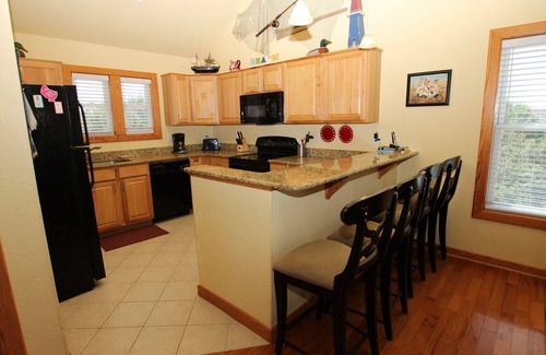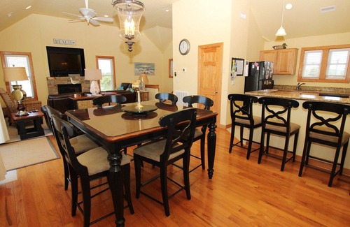 Top Level: Open Great room with flat-screen TV/DVD/VCR and deck access, dining room seating 6 with deck access, kitchen with counter seating for 4, half bath and a screened porch.