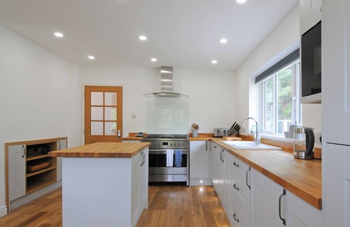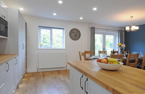 Enter through the entrance hall, leading to the large living area with its cosy wood burner and patio doors leading to the garden. The open plan kitchen/dining room is well-equipped with all the appliances you could need for a home-from-home stay, and also features a large dining table, great for socialising whilst the chef in the family prepares a hearty meal.